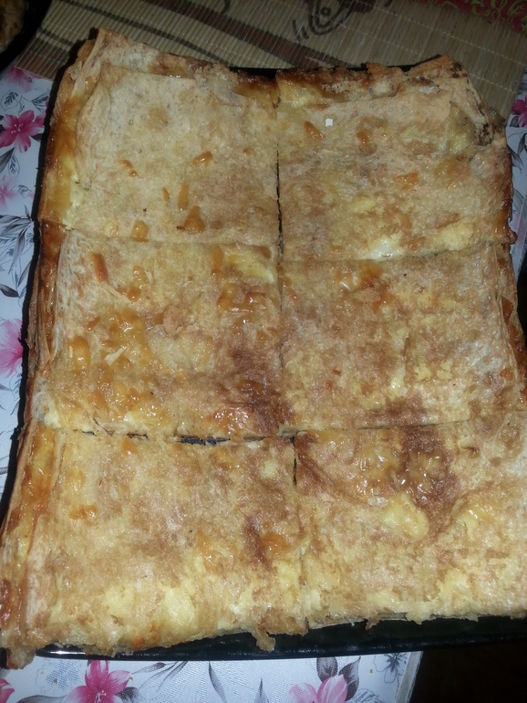 режем лаваш под нужный размер протвиня...выкладываем слой лаваша - слой сыра....у меня получилось слев 5-6...последний лавашик смазываем сливочным маслом (я еще и остатками сыра)....
