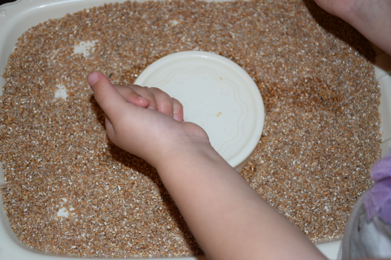 Потом соорудили своё. В центре-вода. Рисовали на крупе растения и обитателей озера.