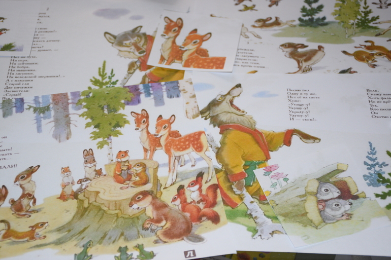 Начали мы с прочтения произведения. М. недавно с ним познакомилась, слушает с интересом и боязнью, особенно в тех местах где волк воет) И комментирует всегда.