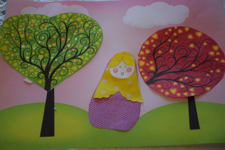 1. Вырезали матрёшку,деревья,приклеили на фон![]()