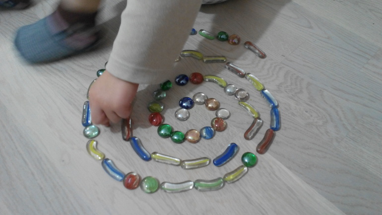 2.5. На полянке у нас было много чего разбросано (детальки от деревянной шнуровки). Собирали сначала фрукты-овощи-ягоды, потом животных, потом геометрические фигуры, заодно повторили классификацию и сами фигуры.