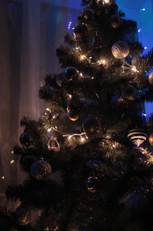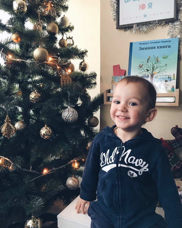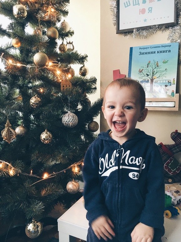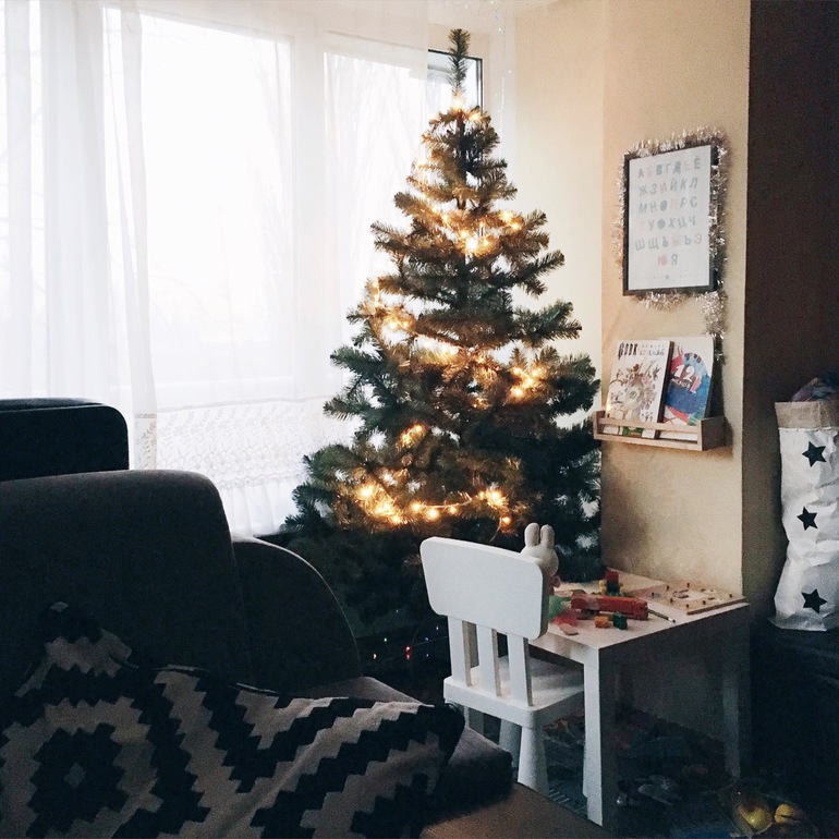 И наша елочка. Сбылась моя мечта - большая елка! Первая в моей жизни! Миша отнёсся к ней спокойно, он и на улице видел наряженные елки) а меня от неё теперь не оттащить)