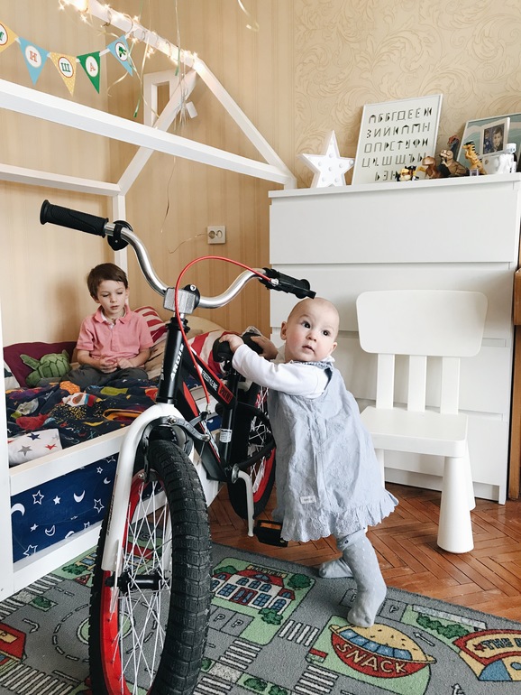 Совсем не доходят руки до Бб, весь февраль проболели, Настя с температурой 40, у меня был бронхит, Миша и муж тоже болели. В апреле у Миши тоже был вирус с температурой 40, без признаков простуды, но за 3-4 дня встал на ноги. а тем временем Насте уже скоро год! Девочка растёт миниатюрная, рост 71, вес 8600-8700 в 10,5 месяцев был. Выглядит месяцев на 7 и до сих пор влезает в мишины человечки 3-6 месяцев))) пока сама не стоит, не ходит, за одну руку может 3-4 шажочка сделать, отрастила 6 зубов, месяцев в 9 стала хорошо есть прикорм. У нас попрежнему СС и гв всю ночь и в течение дня раз 5. По характеру Настя более открытая и жизнерадостная, Миша всегда был осторожным и немного подозрительным к окружающему миру)) эта черта так и осталась) Настя недавно впервые гуляла на площадке и играла в песочнице, к детям очень тянется и это очень непривычно мне) мамкает уже давно и зовёт меня часто, это очень приятно! С Мишей играют дружно, он даёт ей даже своего трансформера Бамблби, любимую Игрушку) сейчас муж уехал в командировку на 2 недели, учусь справляться сама, дети купаются теперь вместе и им нравится! Хотя Настя не большой фанат долго сидеть в воде. Минут 10 это ее максимум. Миша полюбил шахматы, мы занимаемся по детской книге с заданиями, отрабатываем каждую фигуру. Миша может минут на 40 увлечься, но это надо вместе делать. Настя естественно скидывает все фигуры с доски и грызёт их , в общем веселье ещё то ) Настя пока ничего толком не говорит, Миша в этом плане был более развит, четко говорил Папа, баба, дай, нам-ням, зато мама не говорил)) Настя показывает где голова, ушки, ножки, ручки на себе, глазки на кукле. Показывает как фыркает ёжик) горшком пользуемся с 7 месяцев с переменным успехом, по-большому ходит утром и после обеда, в 80% успеваю посадить. Ну вот вкратце и все наверное)