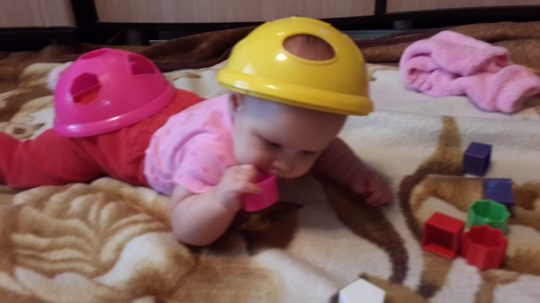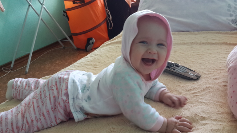 За этот месяц она очень заметно повзрослела. Самое главное - научилась ползать,весь месяц готовилась, качалась, перемещалась по чуть-чуть, а прям на свой день рождения бодро так поползла по всей квартире. Так это мило, червячок такой маленький. Сидит либо как лягушка, либо с опорой на руку, сама еще заваливается. У опоры встает на коленки и так стоит, пока назад не завалится и хорошо, если это на диване, но чаще всего это на полу и прям головешкой об пол, стараюсь ловить. Вообще ее сейчас нигде невозможно оставить - на полу она падает с коленок назад или просто неудачно на спину падает с живота, в кроватке также встает, руки соскальзывают и она деснами бьется об край кроватки, на нашем диване либо об стену головой долбится, либо с дивана падает, в общем, сижу возле нее.