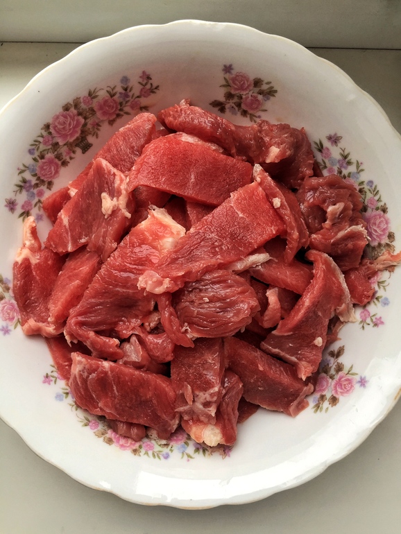 Нарезать мясо тонкими пластинками примерно 2х4 см (подмороженное мясо режется ровно и легко).