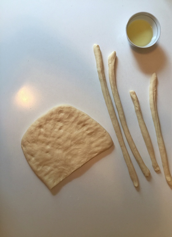 Тесто замесить средне, достаточно мягко, но ни в коем случае не жестко, чтобы его можно было с легкостью тянуть. Руками сформировать прямоугольный пласт толщиной в 2 см, нарезать его на одинаковые полоски шириной в 2 см и аккуратно скатать вот в такие жгуты.