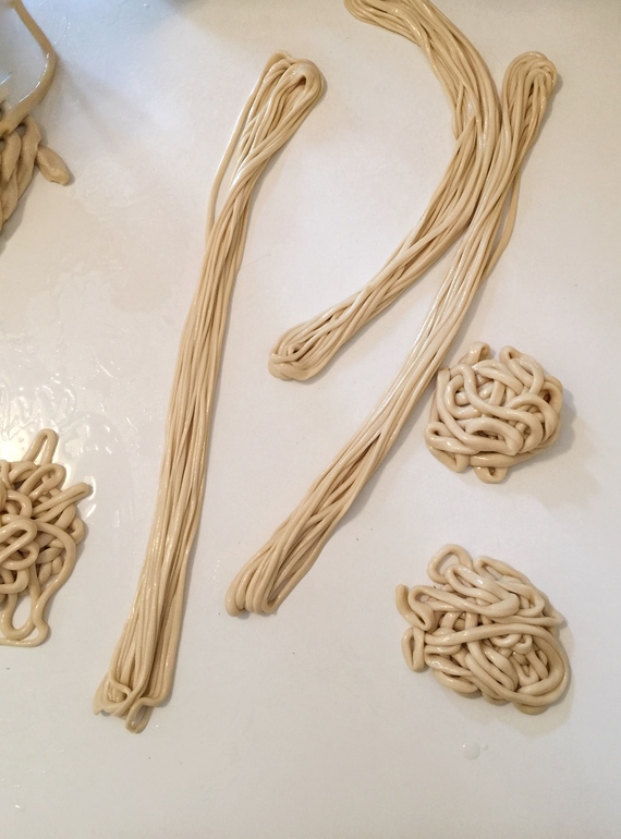 В конце натягиваем на пальцы обеих рук лапшу из одного готового жгута и легонько бьем ее об стол, чтобы она стала равномернее.