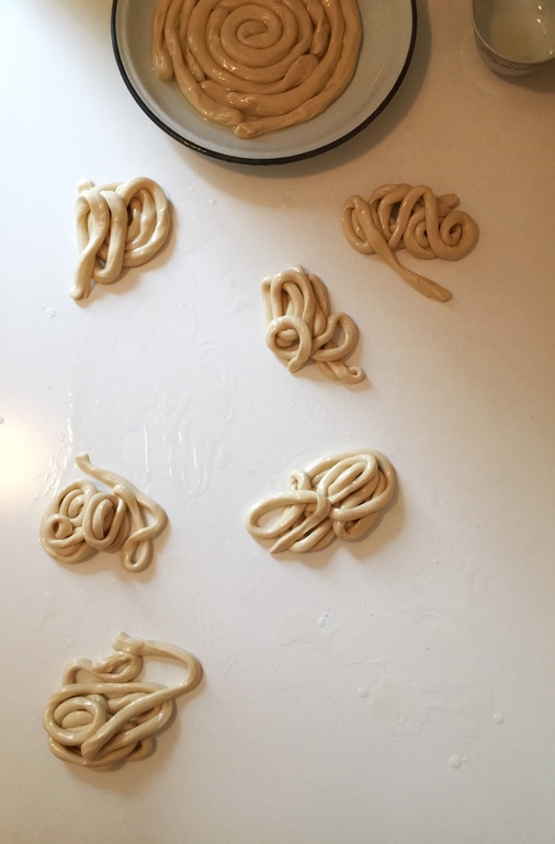 Теперь начинаем аккуратно растягивать каждый из жгутов в более тонкий и длинный, не пытайтесь из первоначального жгута вытянуть сразу тонкий и длинный, это нужно делать в несколько этапов (в 3-4), чтобы не порвать тесто.