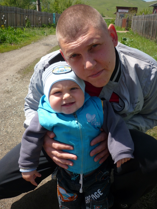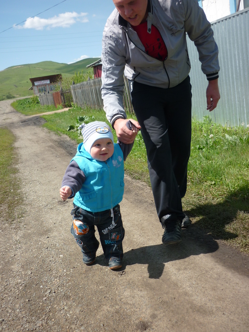 Папа довольный,что сына начинает по-тихонечку ходить))