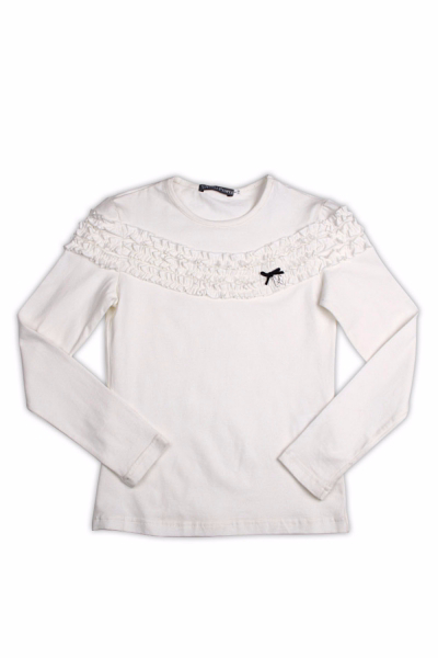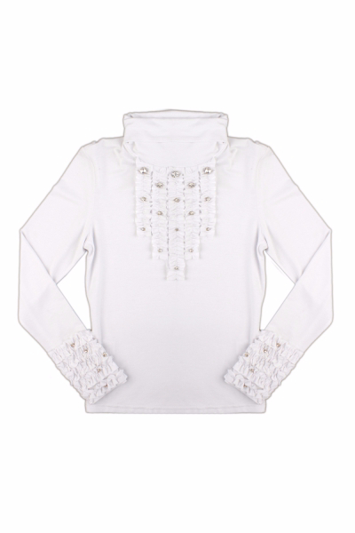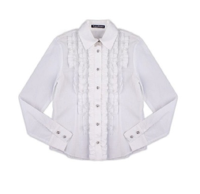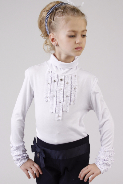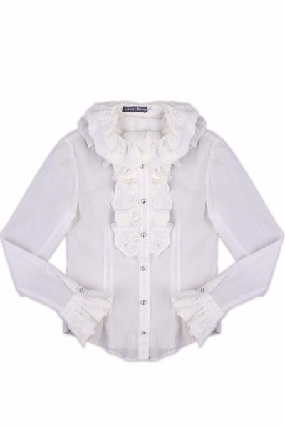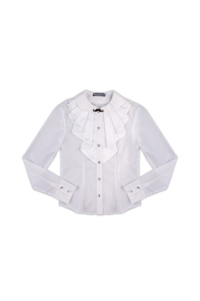 37. Блуза "Волан" для девочки. Школьная блуза с длинными рукавами, манжеты декорированы красивым шитьем, пуговицы на планке и манжетах в виде кристаллов, бочки отрезные, воротник отложной с двойным воланом из шитья и красивым жабо. Роскошный и нарядный образ послужит прекрасным дополнением на официальном мероприятии или празднике. Блузка выполнена из 100% хлопка, легкая, воздухопроницаемая, мягкая, ноская и не статичная.