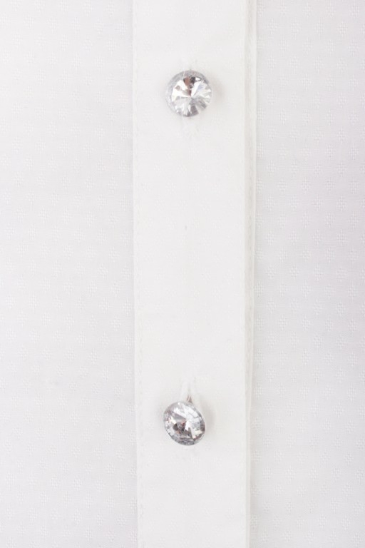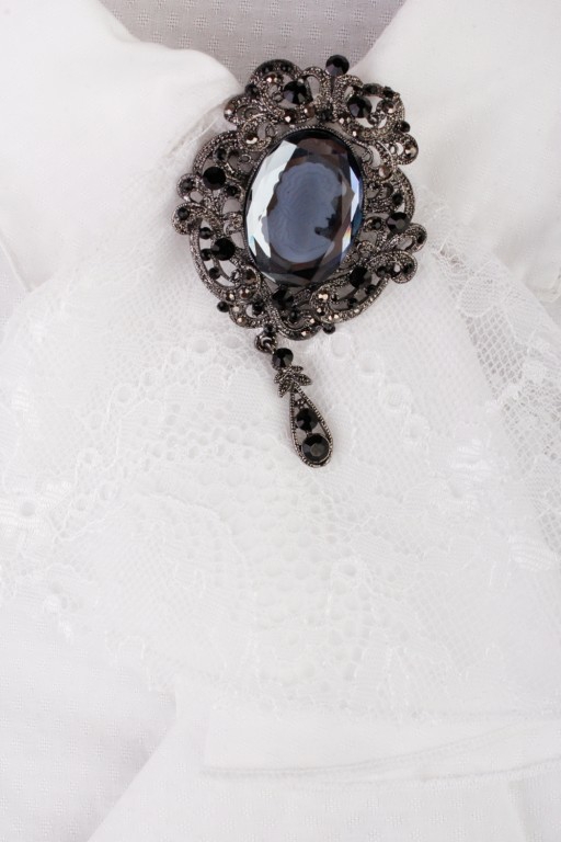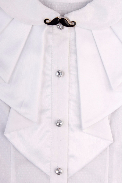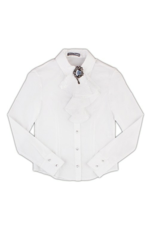 36. Блуза "Жабо съемное" для девочки, цвет белый, с отрезными бочками, подол овальный, отложной стойка воротник со съёмным жабо из нежнейшего кружева на броши в стиле антик, планка на пуговицах из кристаллов, рукава длинные с широкими манжетами и двумя пуговицами также из кристаллов (расположены вдоль манжета). Элегантная и стильная модель из школьной коллекции.