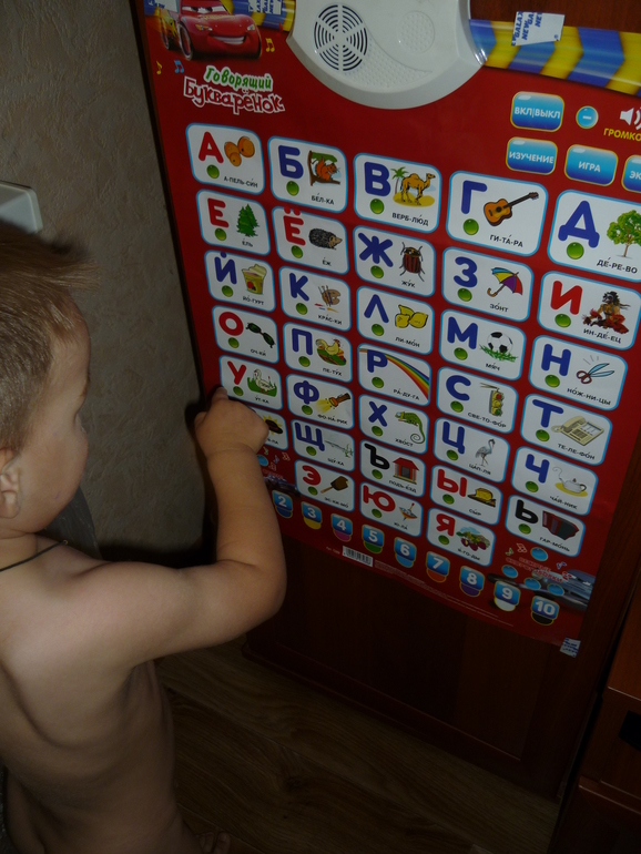 Кстати, купили сыну плакат "Говорящий букварёнок", очень нужная и полезная вещь оказалась! Выучил почти все картинки, которые изображены на разные темы, надеюсь скоро перейдем к буквам и цифрам. С утра голожопик бежит играть скорее: