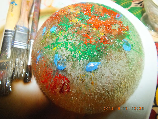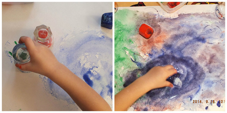 Сначала мы заморозили кусочки цветного льда, замораживали (то есть красили водичку) вместе. Потом рисовали.