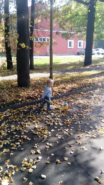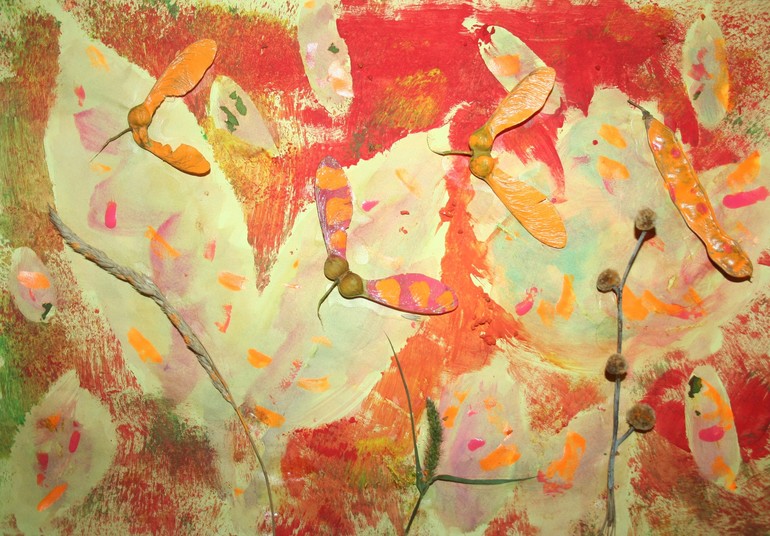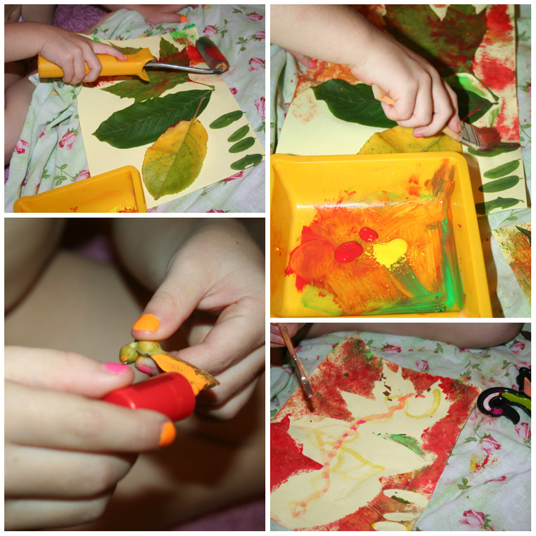 Нам такой способ рисования не очень подходит, сын не любит отпечатки (не вдохновляют они его). Он сразу схватил листья и стал их приклеивать к листу. Затем свободное пространство мы просто замазали красками, затем я отлепила листья.