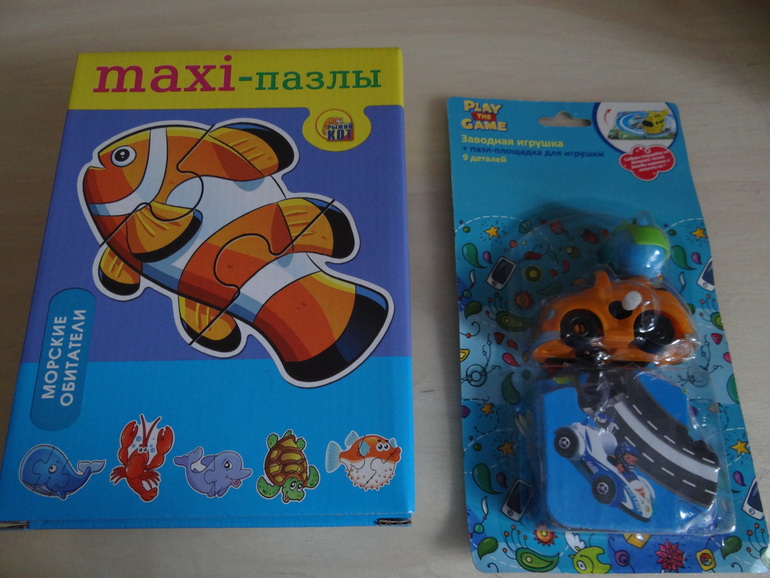 Пазлы Максим не уважает, не любит и не умеет складывать. Рамки-вкладыши - да, пазлы - нет. Поэтому эти из 2-х и 3-х деталей (как раз для начинающих) с нашей любимой темой были куплены, чтобы заинтересовать ребенка. И действительно заинтересовался. Слово "быбы" (рыбы) не сходило с его уст. Давала из 2-х деталей, показывала как соедиять. Старался как мог. Двигает правильно, но вот прям поставить не получилось пока. Не понравился картон - тонковат. Ну для тех, кто уже умеет (хотя вряд ли тогда купили бы пазлы из такого количества деталей), может нормально,но в руках Макса неподатливые детальки норовили помяться. Ну и заводная игрушка с пазлом-площадкой куплена на случай когда надо ребенка чем-то отвлечь/увлечь.