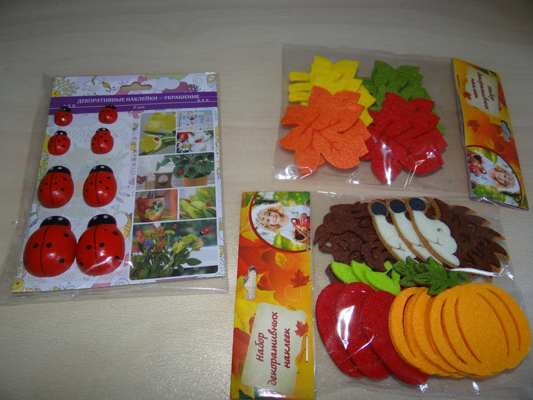 Декоративные наклейки. С осенними наклейками уже придумалась сенсорная коробка. А божьи коровки...да просто...для игры и тех же сенсорных коробок.