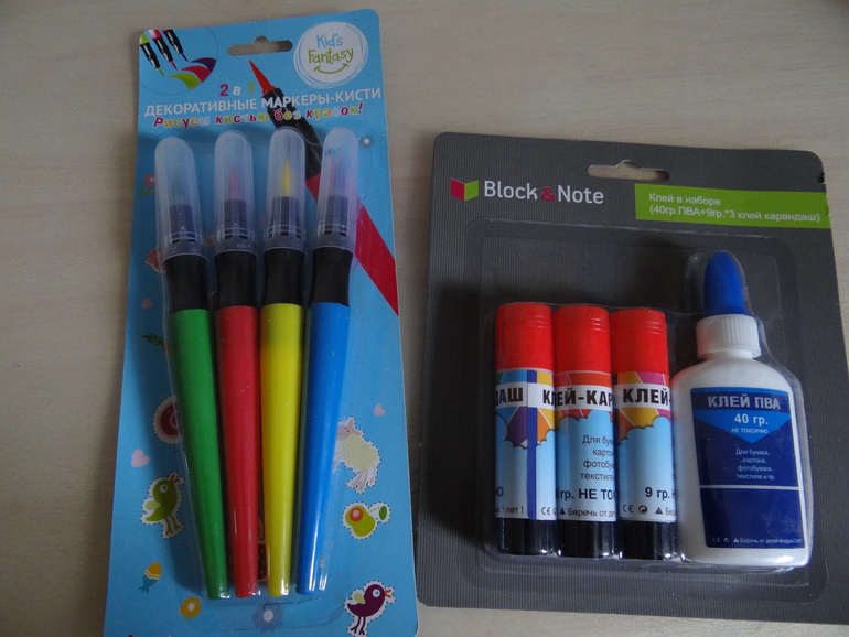 Маркеры кисти для разнообразия и набор клея для аппликаций.