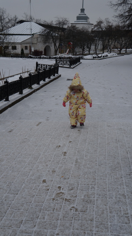 В городе сходили конечно же в кремль. Прошел сказочный снежок. И юнонка всю дорогу шла спиной, разглядывая свои следы на снегу