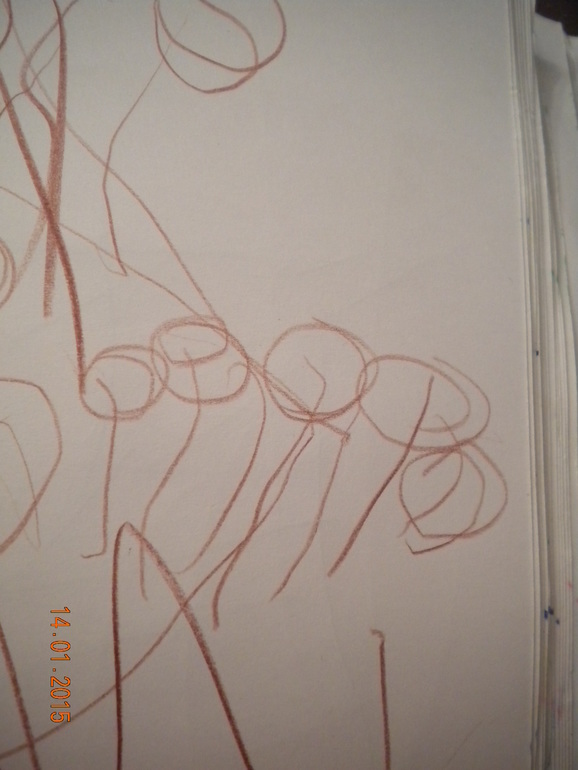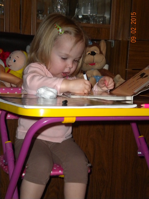 Полюбила рисовать доченька моя хорошая - сама садится за столик и рисует, может конечно и меня привлечь, но так в основном сама. Лепить тоже учимся - научились катать маленькие шарики и по столу расскатывать ладошкой палочки, а потом все это дело размазываем, но все таки рисование ей больше по душе.