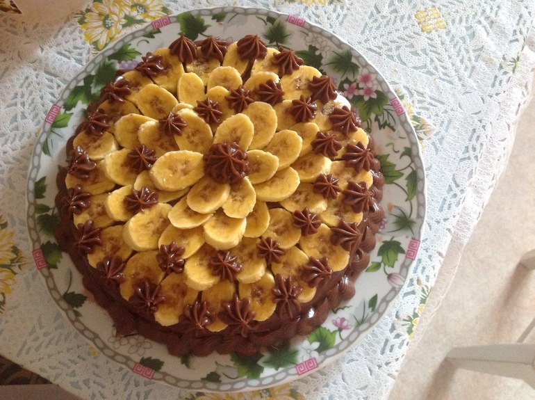 напекла обычных блинов, промазала блины сгущенкой, один слой с грецкими орехами, другой с бананами.
