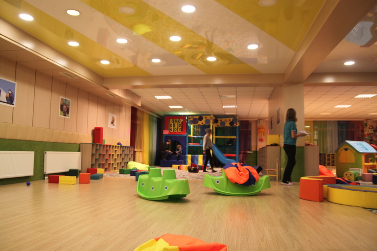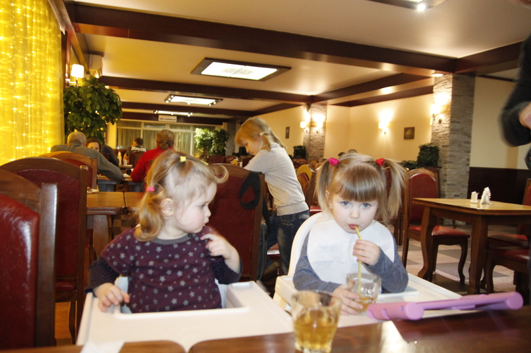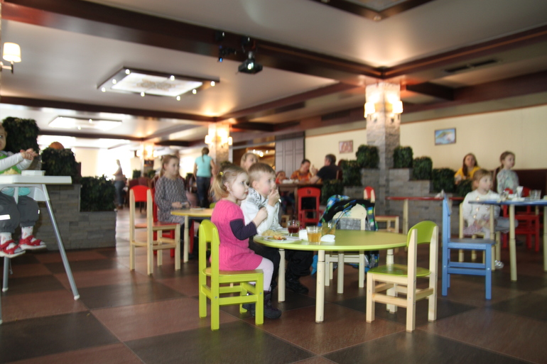 В самом ресторане есть 2 зала, один из них - семейный, с детским экраном с мультиками, с маленькими столиками и стульчиками.