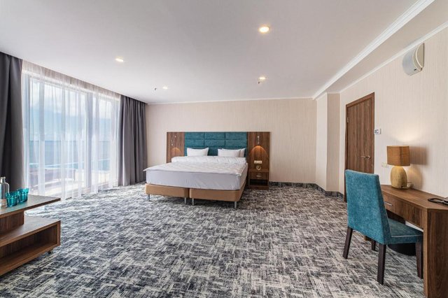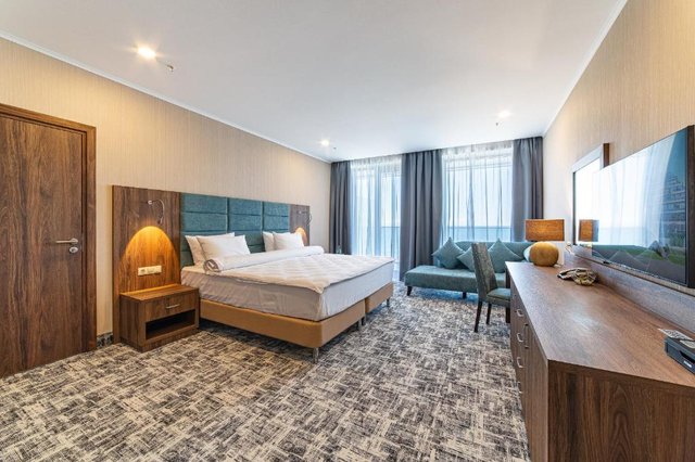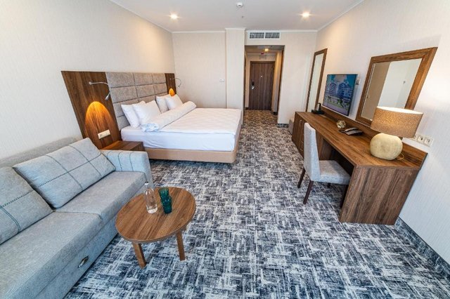 2-местные 1-комнатные номера с доп. местом - кресло-кровать. В ванной комнате: полотенцесушитель, косметические принадлежности, косметическое зеркало, халат, туалет, душ, полотенца, тапочки, фен, туалетная бумага. В спальне: двуспальная кровать, кресло-кровать, белье, шкаф, кондиционер, сейф, звукоизоляция, гладильные принадлежности, утюг, ковровое покрытие, детектор угарного газа, холодильник, электрический чайник, чайный набор,телевизор с плоским экраном, балкон, мебель на улице, вешалка для одежды, сушилка для одежды.