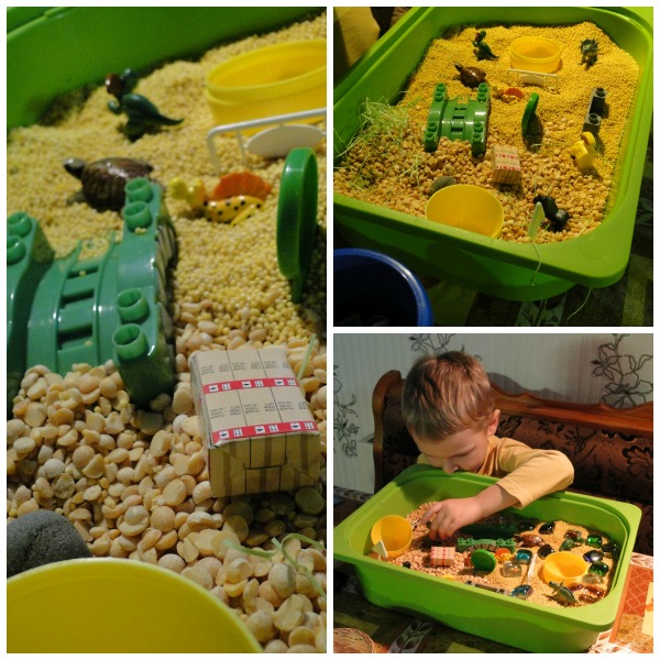 Раньше Глеб как-то обходил стороной песочницу, ну или заходил на пару минут и дальше бегом по своим делам. Наш дед смастерил ему в селе добротную песочницу под яблоней. Но большим успехом она у Глебки не пользовалась. А вот по осени проснулся интерес, начал копаться, придумывать игры. И вот как раз в этот момент погода пошла на спад. Ладно, вроде, проехали этот момент. Но тут знакомые мамы завели разговор о выборе песка. Да еще я книгу Аси Ванякиной прикупила. Вот утром ее листали. Сын долго там все рассматривал. На покупку песка, думаю, бабушка посмотрела бы косо. Да и не так чтобы горит. Про покупку пены подумываю, может тоже понравится ребенку. Мы с Глебкой остановили свой выбор на крупе. Утром отыскала ему коробку икеевскую, освободила ее от обуви, помыла, посушила. А в "Пятерочке" купили два пакета пшена и пакет гороха. Достали разной мелочевки: динозавриков, стекляшки, маленькие машинки, какие-то запчасти, грабельки, лопатки, ложечки из-под мороженого. И мой дитенок с упоением обустраивал свой "уголок" ну полчаса точно, не дергая меня. Я же периодически поглядывала на его возню, и мирно готовила ужин. Очень надеюсь, что коробка будет пользоваться успехом и в дальнейшем. Надо бы найти нашу коробку с солдатиками.