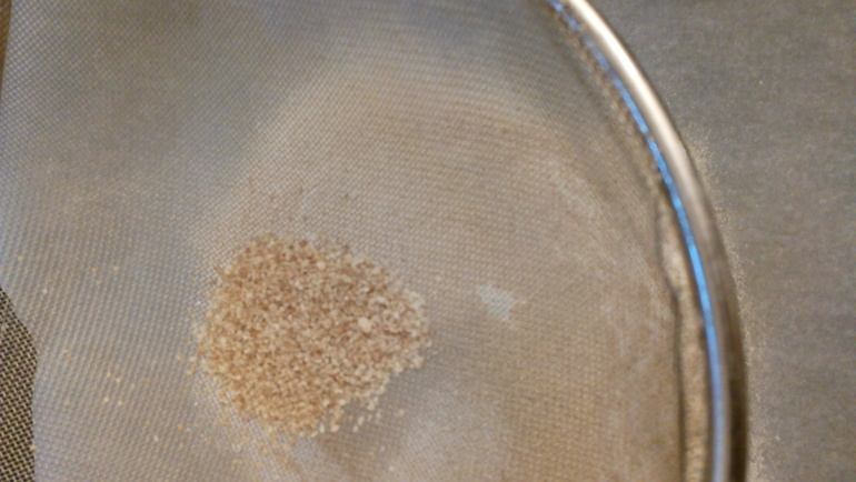 4. Когда меренга готова, мука уже запеклась, просеиваем все с противня ещё раз. Лишний мусор выкидываем.