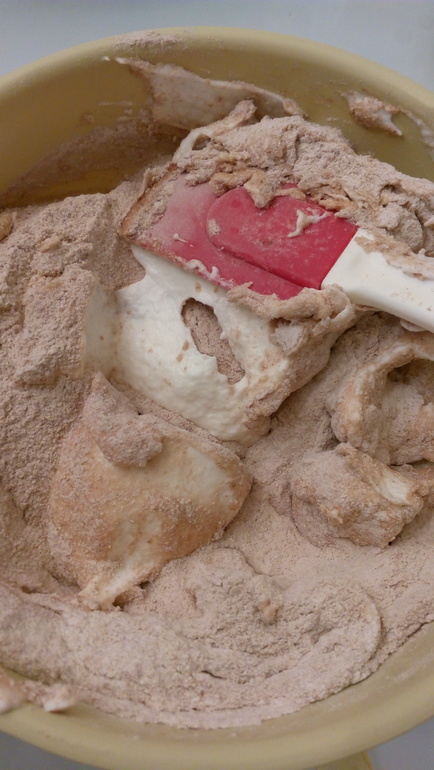 5. И, наконец, самый важный процесс:). Смешиваем меренгу и муку с пудрой. Берём силиконовую лопатку и начинаем мешать по кругу, нежно, аккуратно раз 15-25. Чтобы тесто плавно стекало без обрывов с ложечки.