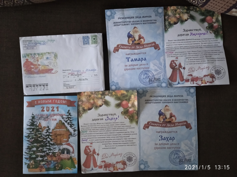 Пришло письмо к нам вчера. А 3.01 мы были в усадьбе Деда Мороза в Москве(Кузьминки).И тут на следующий день письмо, грамоты.Так неожиданно. А, как же мы удивлялись, когда скачали приложение, навели телефон на картинку и ОНА ОЖИЛА: Дед Мороз показал свою мастерскую и помощников. Вот такими приятными сюрпризами начался год.И закончился 2020 тоже сюрпризом от ОЛЬГИ СЧАСТЛИВОЙ.