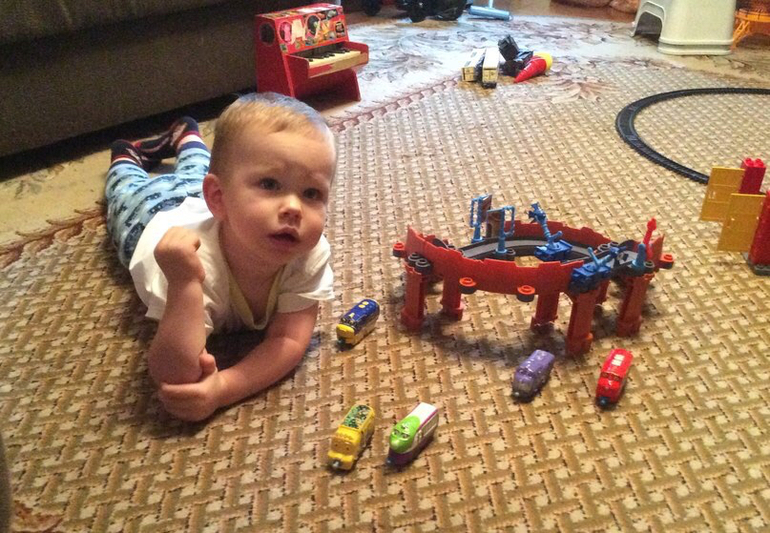 Ну а так, цифры до десяти знает, пальцами по очереди считает, но говорить же не может), знаем букву А, показываем везде и громко поизносим). Цвета, формы, животные, транспорт давно как-то запомнил, поэтому упорным ранним развитием не занимаемся. Катаем машины и паровозы. Паровозы-наше все, последнее время) полюбил вставлять мозайку, из теста делать шарик и колбаску, пазлы простейшие собирает, домино очень любит. А еще, наконец к моей радости, в нем проснулся художник))) рисуем каляки-маляки везде)) книжки читаем, мультики смотрим. вот сейчас сидит и пьет из лейки))) полить, помыть, подмести-это святое) вообще, заметила, что нас пока миновал период разбрасывания... Наоборот, ходит все закрывает и на место складывает.