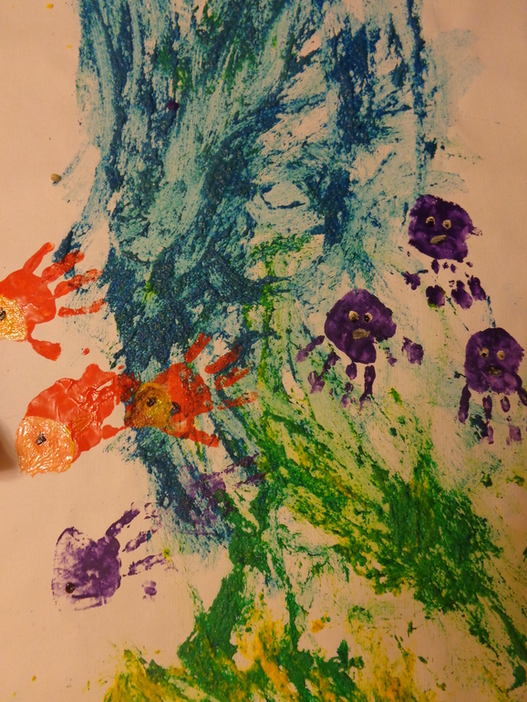 Наше море.Сенсорная коробка с ракушками и камеками.Даша сама наигравшись с морем сделала любимую песочницу)))).Рисовали море ,фирменными пальчиковыми красками.