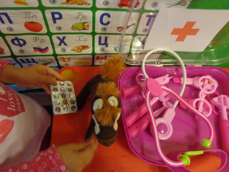 Всех игрушек разбили на пары-мама ребенок,и выстроили в очередь на прием.Всех осмотрели и вылечили.Таблетки пластилиновые шарики)))пустые флаконы из под реальных Дашиных лекарств.и Бинт и вата и шприц без иголки...все по настоящему)).