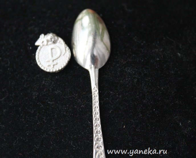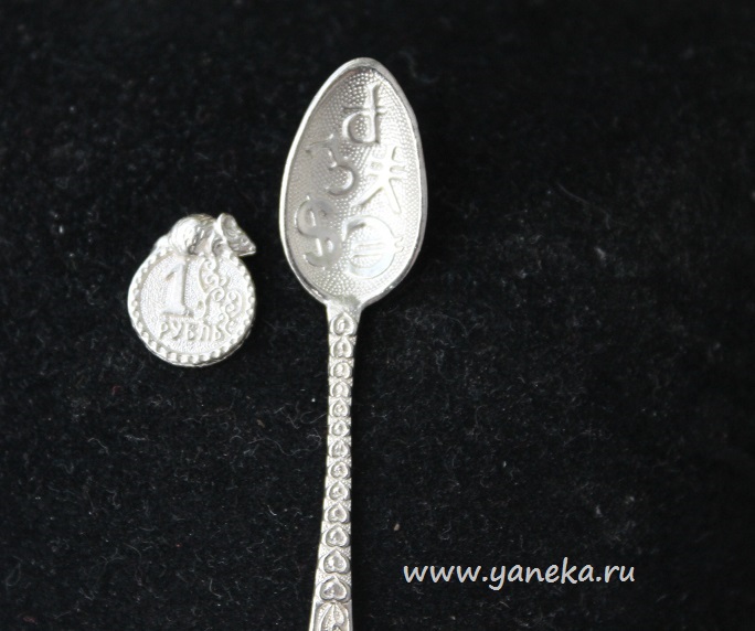 И ложечка и монетка выполнена из серебра 925 пробы в ювелирной мастерской на заказ.