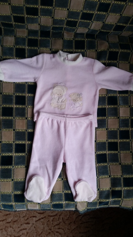 Мягонький костюмчик до 2х или 3х мес , в идеальном состоянии, в коробе , никаких следов носки , все стразики на месте. Одевали мало , т.к. не пришелся по сезону , девочка июньская.