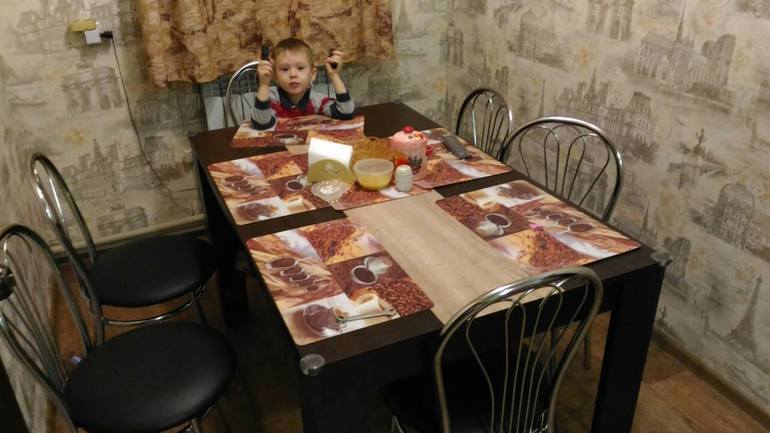 Стол брали в Онлайн-трейде тысяч за 6, как видите раз стол новый то нужны подставки под тарелки, первые дни это были порезанное вафельное полотенце. Так что ждем когда нам разрешат всю эту фигню убрать со стола и есть нормально
