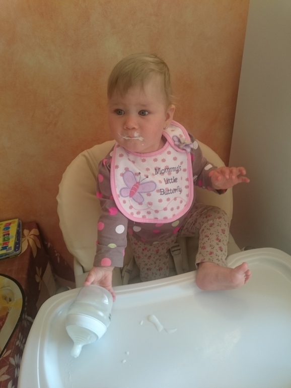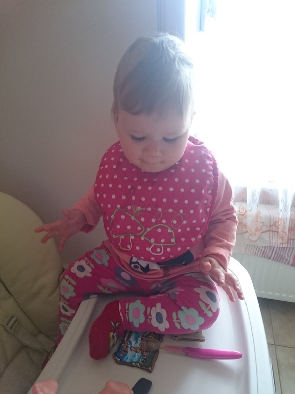 Кстате,в стульчике для кормления тоже долго не сидит,сама вылезает оттуда.