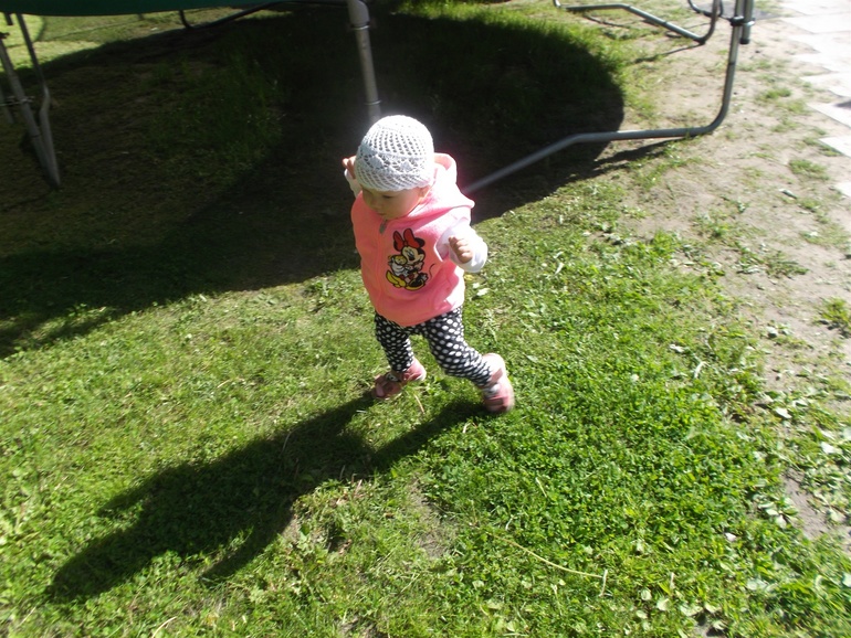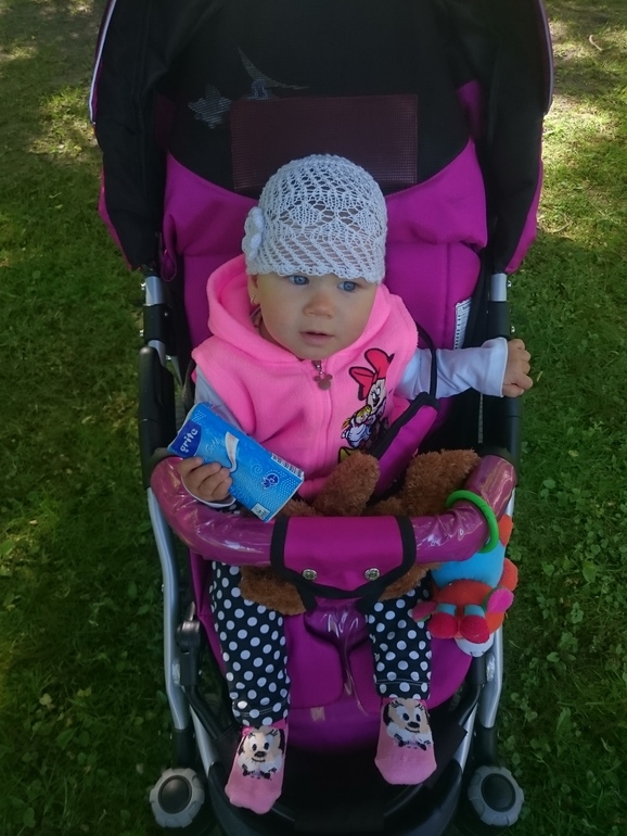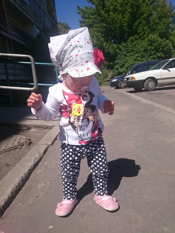 Анютка топает уже хорошо,стала очень не послушной .В коляске не сидит,орёт,в автокресле тоже.Везде и всюду ей самой надо ходить.