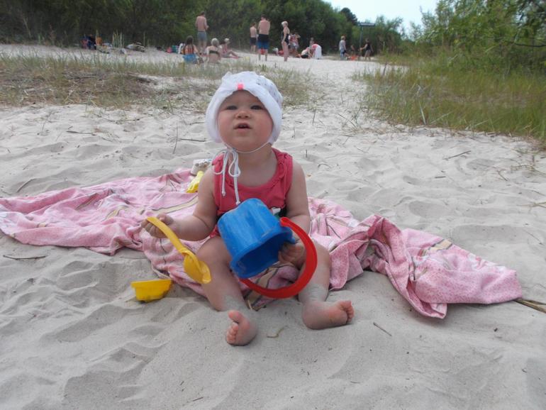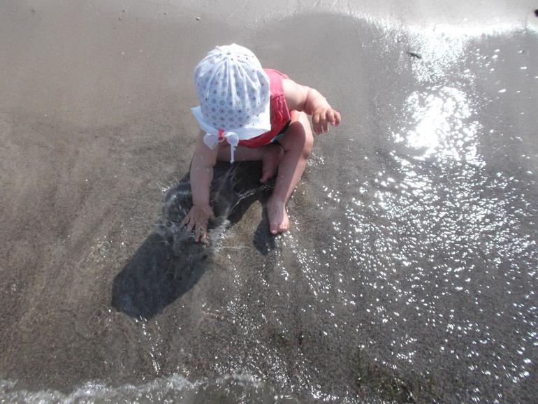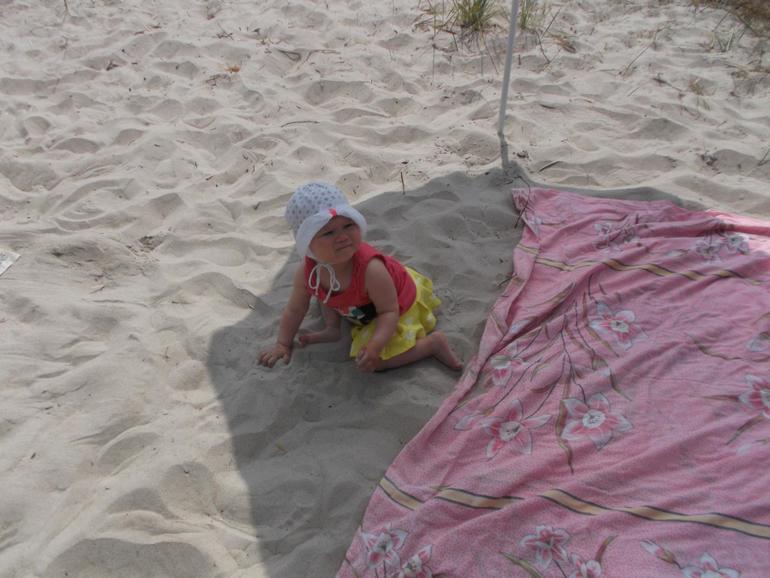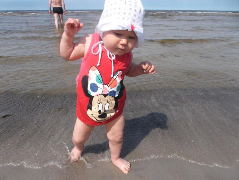 Вот и мы на 3 ей неделе все же занырнули в море:) сначала боялась и не подходила. А вот 2 дня сама несется и сидит в песочке.