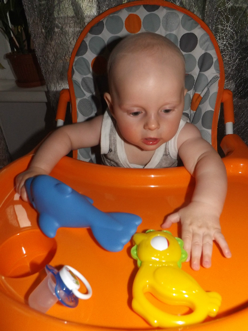 Вот и нам уже полгодочка! растет наш зайчонок, радует маму и папу и братишек.8 мая наконец то прорезался наш первый зубик!, а следом(12 мая) и второй подоспел. сейчас они уже подросли- беленькие и кусучие. а еще всей семьей с трепетом наблюдали попытки встать на четвереньки и сесть-несколько дней мы замирали, когда Сева делал новые движения!! теперь Севушка уверенно встает на четвереньки, ползет-только пока назад получается и сидит (иногда с опорой на ручку). попробовали неделю назад кашку гречневую 50 гр (Nestle)развожу своим молочком- сьедает с удовольствием,еще едим пюре- тыква, цветная капуста, морковь. фруктовые пока не понравились, попозже попробуем дать опять.как только в нашем рационе появилась кашка- какать стал 1 раз в день и гуще, а до этого по 3-4 раза .к педиатру идти только аж 6 июня ( будут делать 3-тью прививку) ,так что вес свой и рост узнаем не скоро.вот какой у нас веселенький малышок!