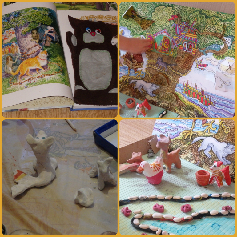 По закону притяжения информации, всё вокруг вдруг стало сказочным и народным. И конечно, нам хочется везде, а Насте ещё и сразу. Я не знаю, можно ли так, но мне само включение Настиково очень понравилось. Чтобы и Лукоморье, и Котов наших народно-игрушечных, и слова заветные - всё включить вместе.