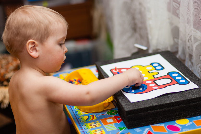 Берем пенополиэтилен, пару пачек канцелярских гвоздиков и картинку. Развиваем мелкую моторику и цветовосприятие)