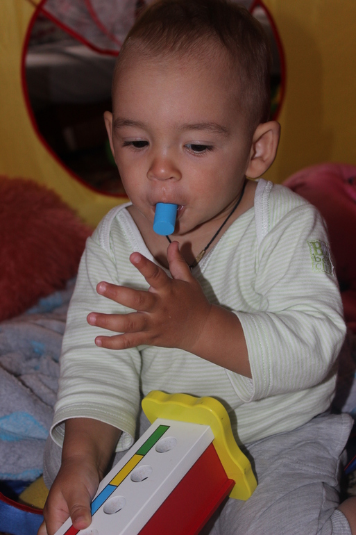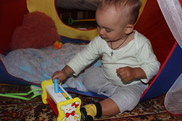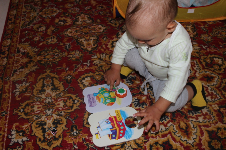 Ну вроде бы и все из новенького. А так все по старому, усовершенствуем старые умения. А еще у Никиты нет усидчивости. Поэтому пирамидка, сортер, всякие книги интересуют его максимум на минуту.