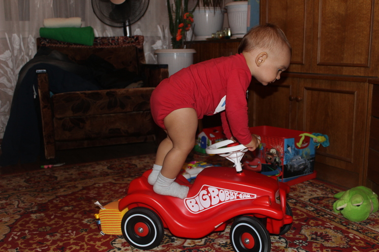 Сажает свою попу, разворачивается спиной и садится, прям как взрослый..Умеет садиться и слазить с машинки.
