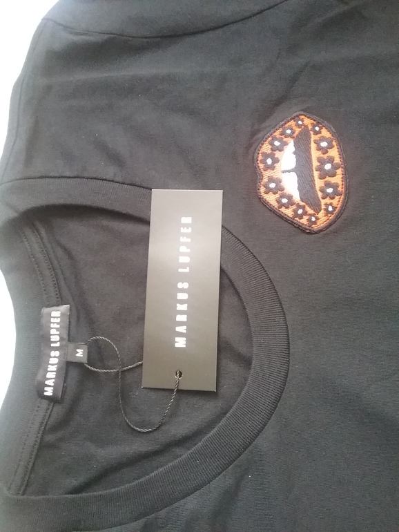 Футболка черная очень приятный хлопок. Маркировка М,но большемерит.в предзаказе 52€. Отдам за 2500 руб без торга.Пог 51,5 см,плечи 39 см,длина 65 см.