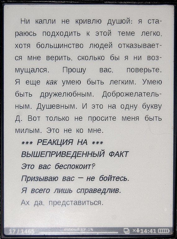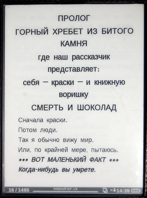 Третье удивление - от Литреса. Первая легальная книга оттуда. Почему-то во мне жил миф, что версии Литреса отличает какая-то особая правка, корректура и читать их просто. Ну-ну((( Здесь начало каждой части, каждой главы интересно построено, много замечаний "на полях". Отвратительно было воспринимать! Вот уж точно - хотелось бумажную версию.