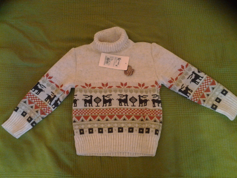Дома мы едва просунули голову, очень узкий шов под горловиной. Сам свитер нам большой, плечи широки, рукова длинны, ткань толстая, грубоватая, практически не тянется, не принимает форму тела, полотно топоршится пузырями на плечах, ребенок как в доспехах. А горловина очень узкая, снимали со слезами. Повезу возвращать оба. Хорошо, что не заказывала по почте и по предоплате.