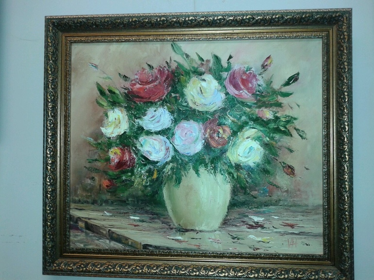 А вот и натюрморт. Егор почему-то захотел именно такой: с вазой,цветами и яблоком