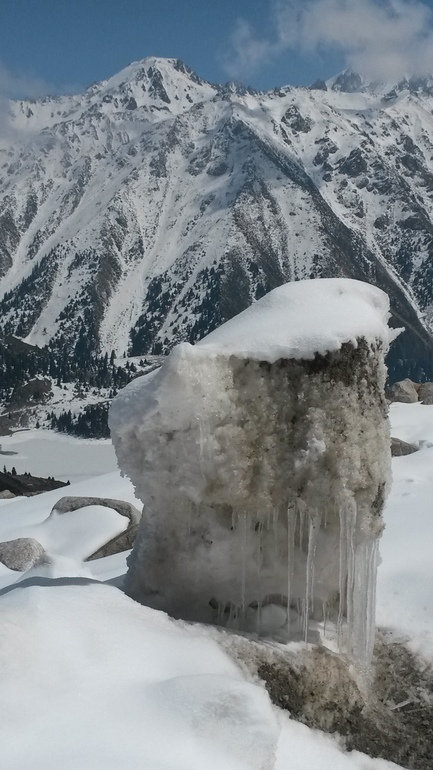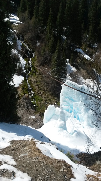 если приглядеться, видно трубу, она прохудилась в нескольких местах и вытекающая вода создала потрясающий ледник с голубым оттенком, здесь же ниже шумит горная речка. Из родника я пить не стала, уж очень холоднющая вода))