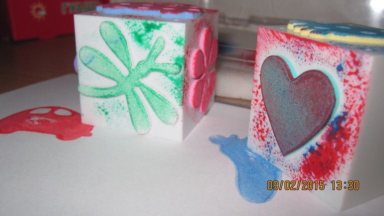 Вот такие штампики получились за 15 минут! Наклейки на кубике из магазина Фикс Прайс, давненько прикупила их и вот нашла применение. Просто обклеила ими кубик)) В коробочке кусочек поролона промазала гуашью. Вот собственно и все! Ребенок в восторге, и в садике такое заказали